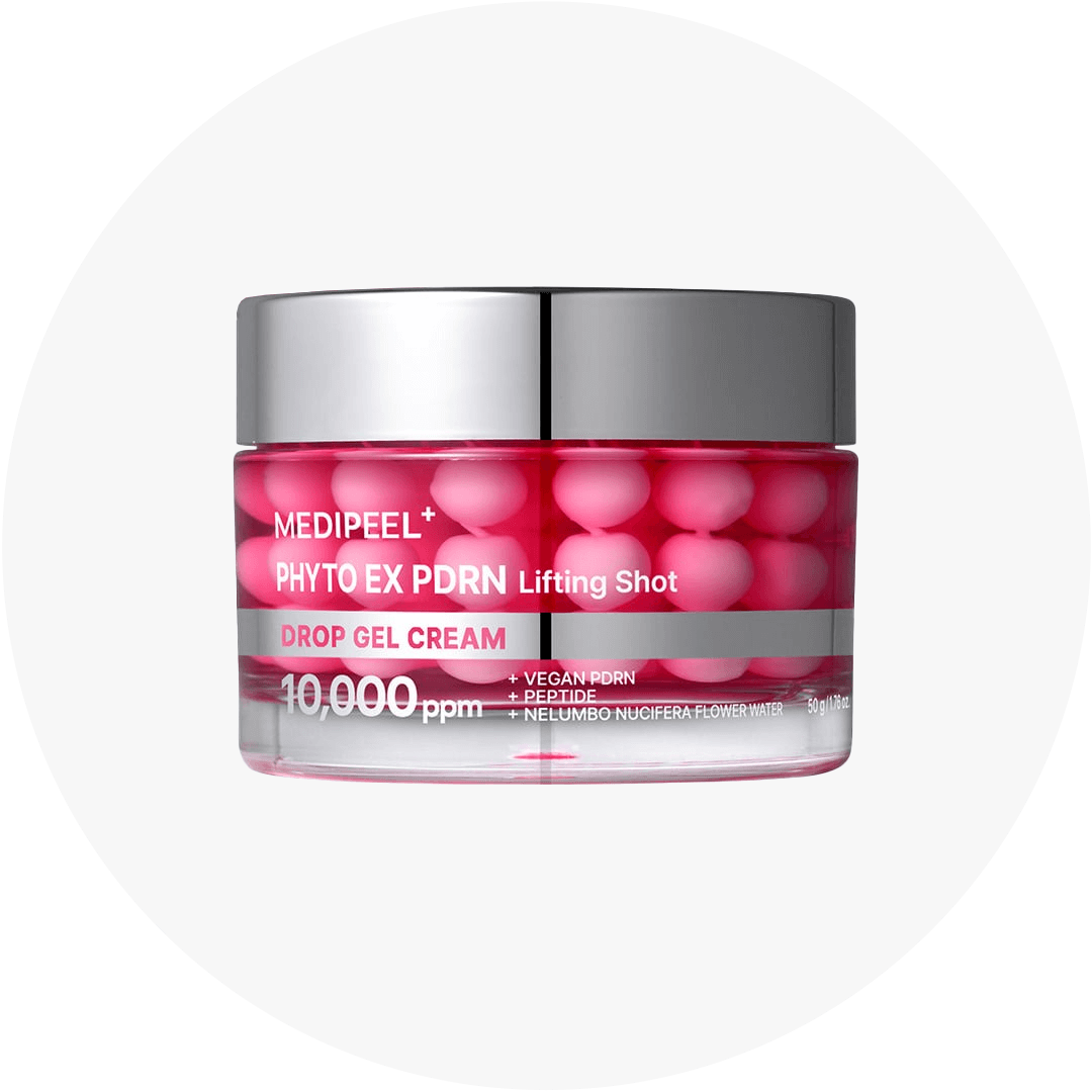 MEDIPEEL Phyto Ex PDRN Lifting Shot Drop Gel Cream містить PDRN, які стимулюють регенерацію клітин і покращують щільність шкіри. У складі також фітоекстракти, капсули з активними пептидами, гіалуронова кислота для зволоження та антиоксидантний комплекс для захисту від старіння.
