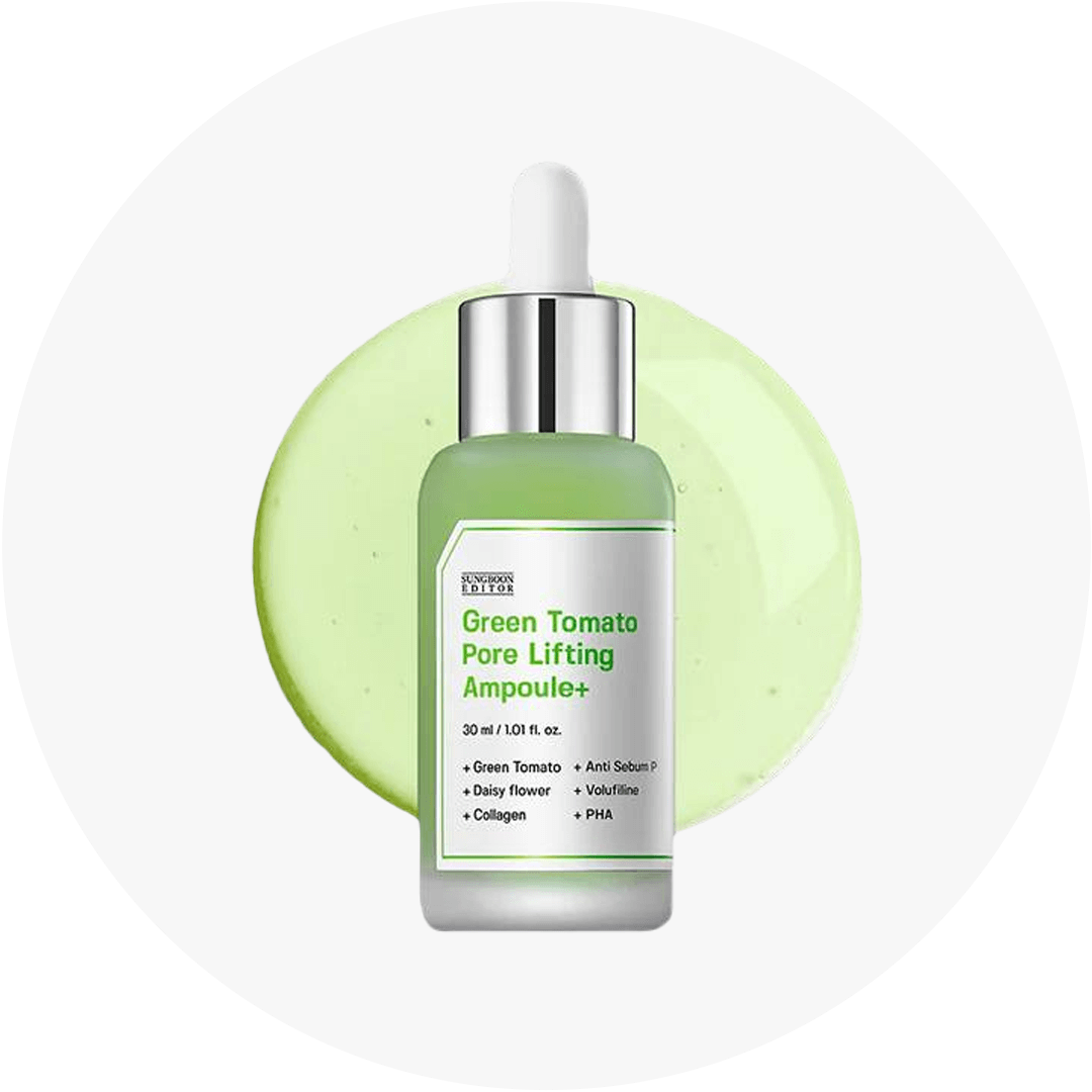 Sungboon Editor Green Tomato Pore Lifting Ampoule+ – ефективно звужує та мінімізує видимість розширених пор, робить шкіру більш гладкою, пружною та витонченою.